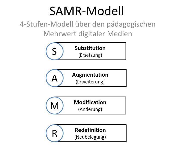 Das SAMR-Modell ist ein von Ruben Puentedura (2006) entwickeltes Schema, das aufzeigt, in welchem Maße sich mit dem Einsatz digitaler Werkzeuge der Unterricht innovativ verändert und damit weiterentwickelt.