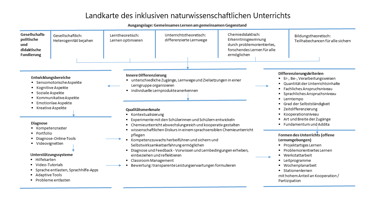 Die Landkarte zeigt mögliche Wege zu ganz unterschiedlichen Formen des inklusiven Unterrichts. Das will sagen: Es gibt nicht nur eine Form des inklusiven Unterrichts – von der Lernwerkstatt über den forschenden, problemlösenden Unterricht bis hin zum projektartigen Lernen sind vielfältige Ausprägungen umsetzbar.