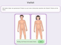 In der Übung werden immer zwei Körper angezeigt, die sich an mindestens einer Stelle unterscheiden. Die Kinder bekommen die Aufgabe, einen Unterschied zu finden und die entsprechende Stelle anzuklicken. Bei einer richtigen Auswahl bekommen sie das Vielfaltsmerkmal benannt. Anschließend soll eine Reflexion mit der Klasse über vielfältige Körper stattfinden.