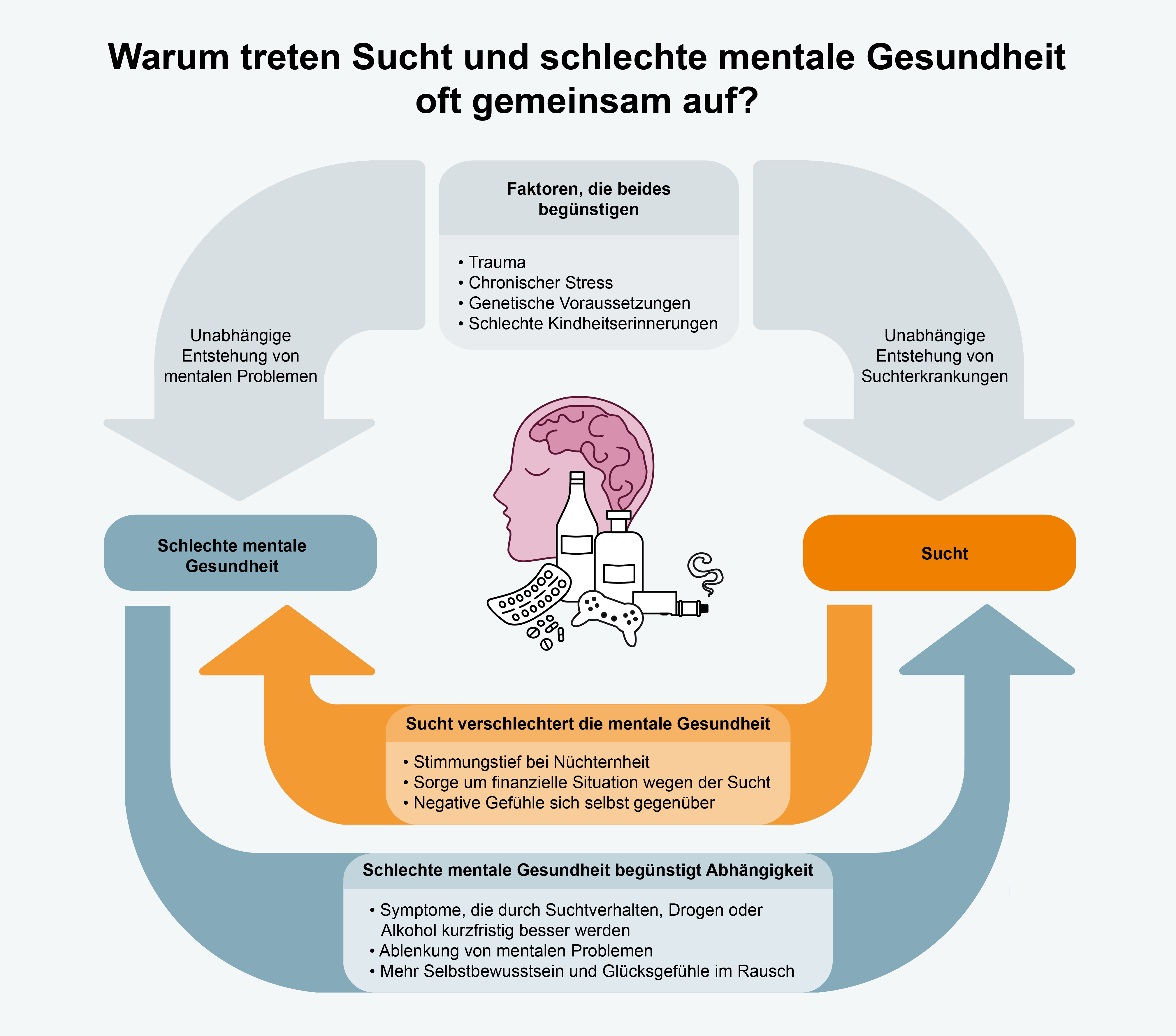 Die Infografik zeigt, wie Sucht und mentale Gesundheit zusammenhängen.